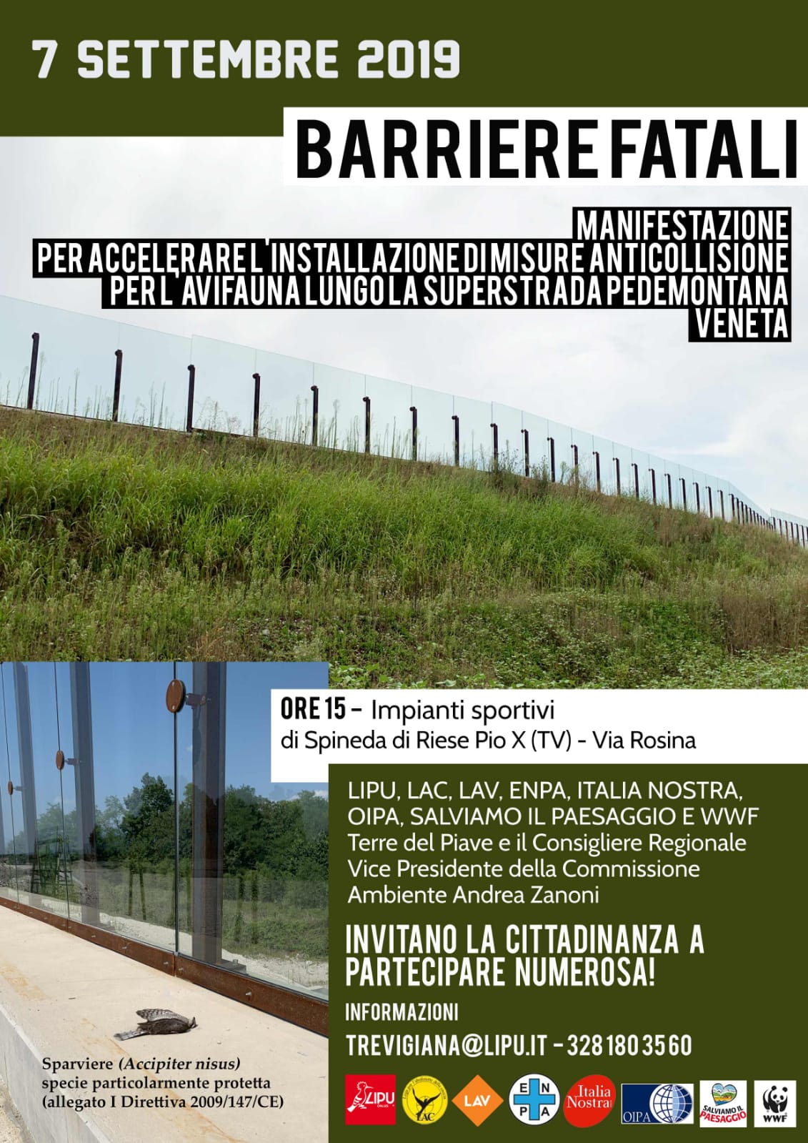 La devastazione che accompagna la costruzione della Superstrada Pedemontana Veneta non ha limiti. Lungo la Supestrada si stanno installando delle barriere fonoisolantitrasparenti molto pericolose per l'avifauna. Quando l'opera sarà terminata se ne conteranno qualche migliaio e andranno a formare un muro di vetro che complessivamente misurerà diversi chilometri. Sono stati trovati, nel corso di sopralluoghi fino a fine giugno, più di centocinquanta esemplari di uccelli morti appartenenti a varie specie, alcune superprotette come falchi, picchi, rondini. E' verosimile stimare che, se non si prenderanno provvedimenti intervenendo su tutta la tratta, ad opera conclusa verranno rinvenuti morti, ogni anno, migliaia di esemplari.