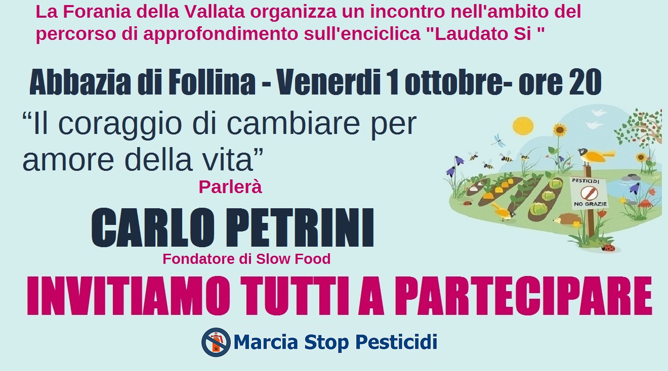 Venerdì 1° ottobre alle 20:00 nell’abbazia di Follina ci sarà una “lezione laica” di Carlo Petrini sul tema “Il coraggio di cambiare per amore della vita”. Conosciuto come Carlin, Petrini è un gastronomo, sociologo, scrittore nonché fondatore dell’associazione Slow Food.