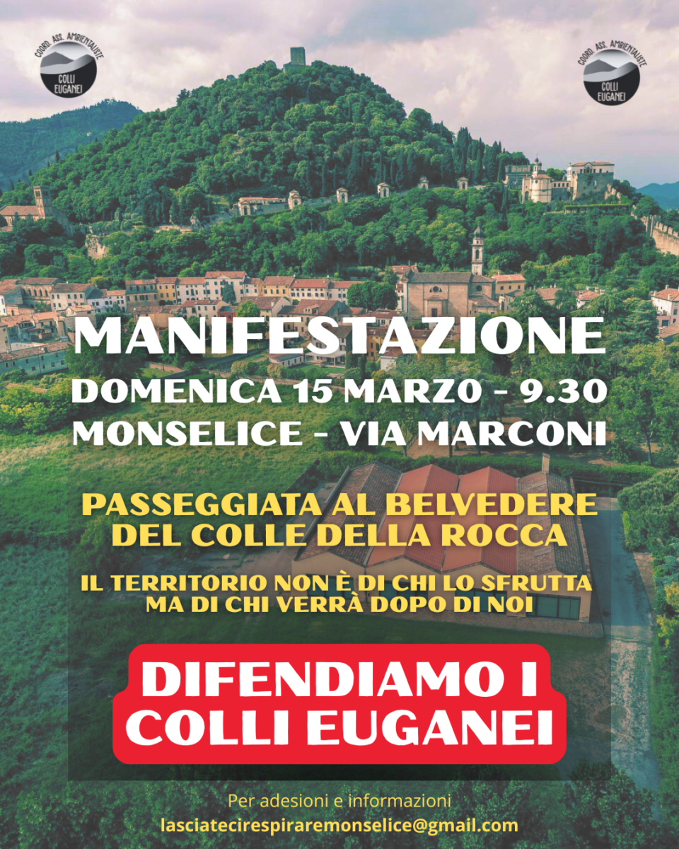 Il Coordinamento Associazioni Ambientaliste Parco Colli Euganei promuove una manifestazione pubblica dal titolo “Fermiamo il nuovo assalto di cemento ai Colli Euganei”, domenica 15 marzo con appuntamento alle 9.30 in via Marconi a Monselice.